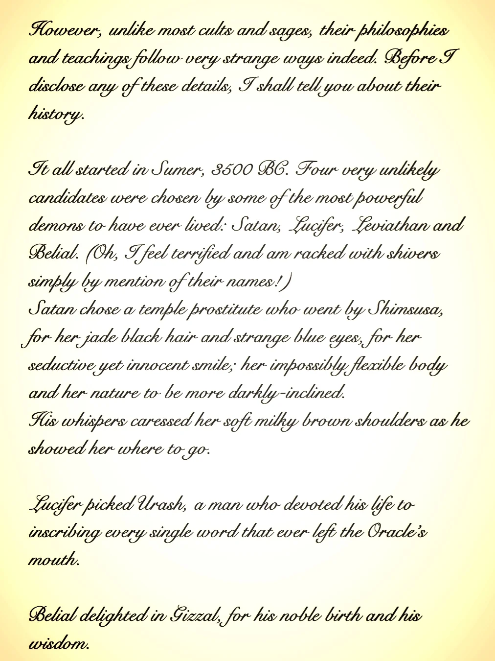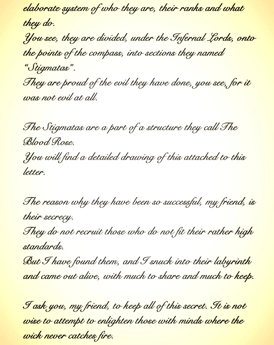Their group grew larger and stronger as they found the right recruits with the aid of the infernal princes. While they exponentially spread out over the world, they knew to hide their knowledge from the public, keeping it all to this higher order of creative, strong and wealthy individuals.